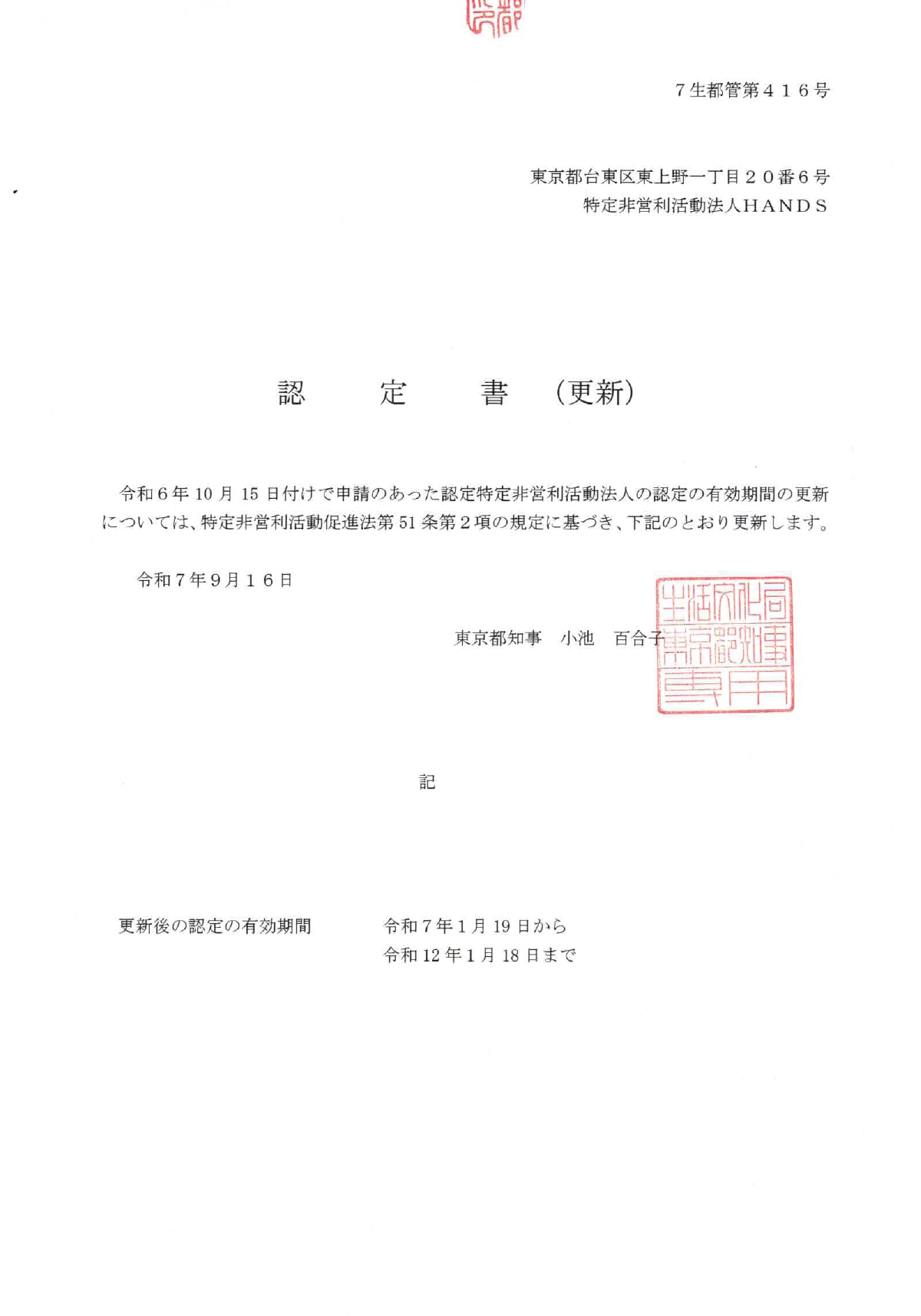 このたび、HANDSは2025年9月16日付で、東京都より「認定NPO法人」としての認定を更新されたことをお知らせいたします。これもひとえに、HANDSを支えてくださるたくさんの皆様のおかげです。いつもHANDSにお心をお寄せくださっている皆様に感謝申し上げます。