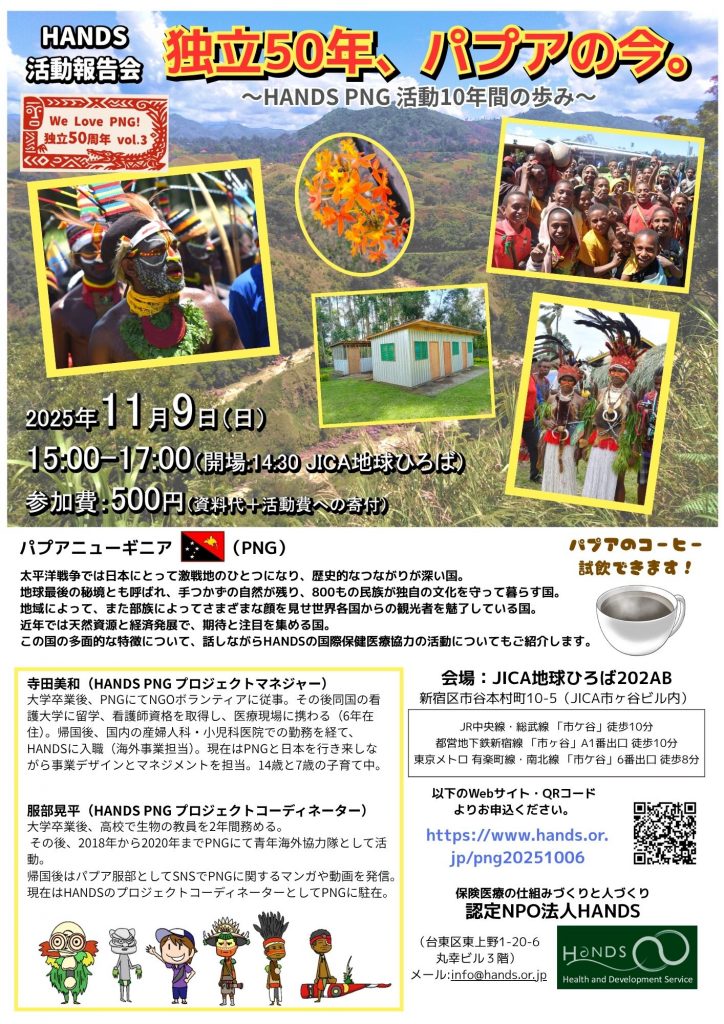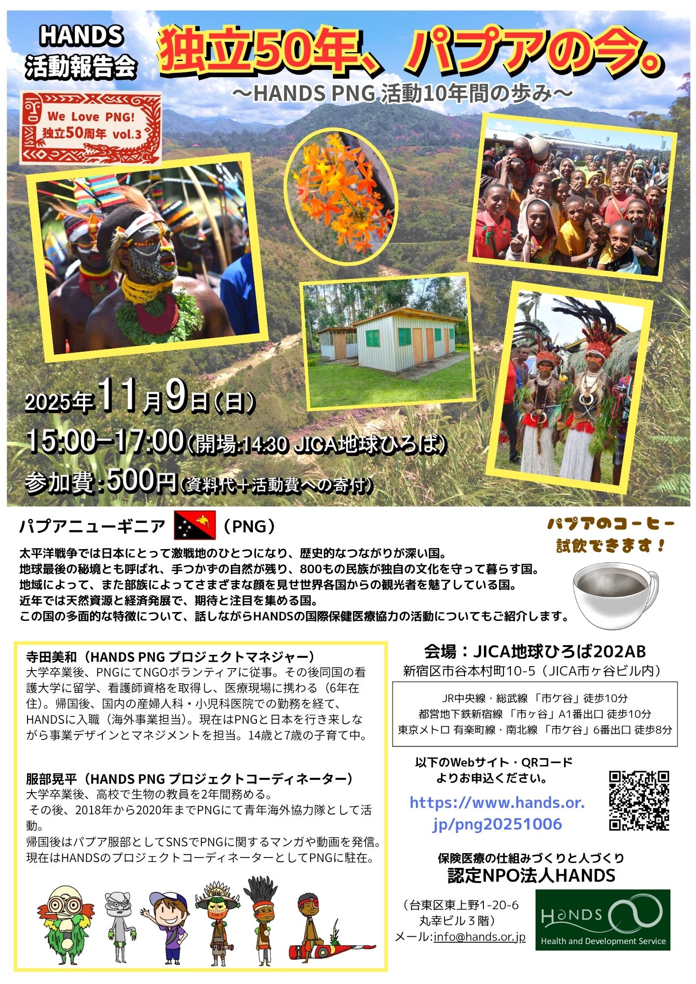《パプアニューギニア》太平洋戦争では日本にとって激戦地のひとつになり、歴史的なつながりが深い国。地球最後の秘境とも呼ばれ、手付かずの自然が残り、800もの民族が独自の文化を守って暮らす国。地域によってまた部族によって、様々な顔をみせ世界各国からの環境客を魅了している国。近年では天然資源と経済発展で、期待と注目を集める国。この国の多面的な特徴について、話しながらHANDSの国際保健医療の活動についてもご紹介します。